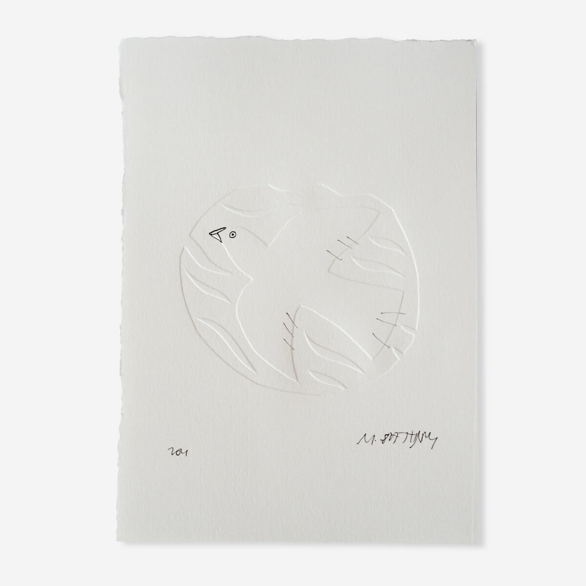 An embossed and hand drawn illustration of a bird by printmaker Meg Fatharly. The process of embossing creates raised areas which add depth and delicate texture depending on how the light falls.